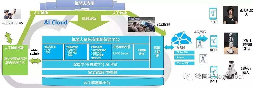 未来,云端智能机器人系统可以把人工辅助监督、记忆知识内容、低频次的认知类决策神经网络等功能仍然放在云端大脑,逐步把视觉识别、语音识别和智能运动等 AI 感知能力,以及需要实时响应的功能模块放在端侧和边缘计算节点,边缘计算节点和云端大脑通过机器人安全专网相连。