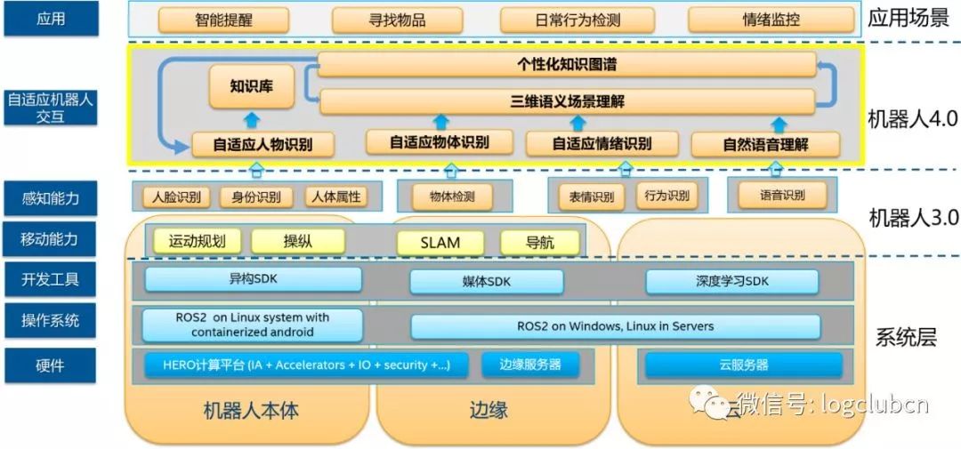 针对这些需求,英特尔中国研究院提供了面向机器人 4.0 的基础通用参考平台——HERO系统平台。底层是硬件计算平台,上面是软件层。机器人 3.0 的部分,包括基本感知和交互、运动导航、规划、操纵。机器人 4.0 部分更多支持自适应交互和持续学习,包括三维场景的语义理解和个性化的知识图谱。