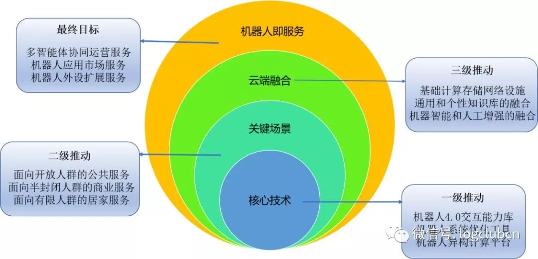 类似互联网的三级火箭发展模式,第一阶段——关键场景,把握垂直应用,提高场景、任 务、能力的匹配,提高机器人在关键应用场景的能力,扩大用户基础;第二阶段——人工增强, 通过加入持续学习和场景自适应的能力,延伸服务能力,取代部分人力,逐步实现对人的替代, 让机器人的能力满足用户预期;第三阶段——规模化,通过云-边-端融合的机器人系统和架构, 让机器人达到数百万千万级水平,从而降低价格成本,实现大规模商用。