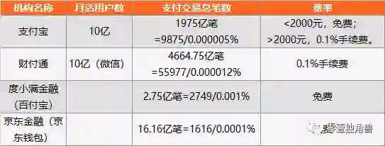 BATJ的支付业务中,微信和支付宝支付业务频繁,成本压力大。微信收费中、支付宝即将收费,或与交易笔数、金额日渐庞大有关。度小满支付和京东钱包的压力相对较小。
