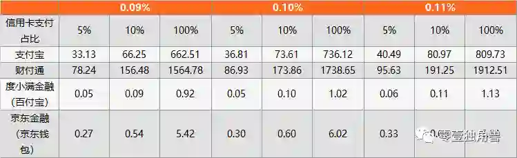 由于国内持有信用卡的人数占比不高,京东和度小满信用卡还款产生的成本相对有限。根据央行Q3支付报告,人均持有信用卡占银行卡数的8.85%,笔者对信用卡支付占比设定为5%、10%。以微信为例,如果通道费率为0.09%,信用卡占比为5%、10%,微信可以通过手续费获得8.69亿、17.39亿元;如果通道费率为0.11%,信用卡占比为5%、10%,微信需要进行补贴。