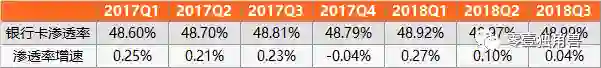 中国银行卡渗透率逐年提高,2018年第三季度渗透率为48.99%,中国银行卡消费总量累计超过了24.05万亿元。