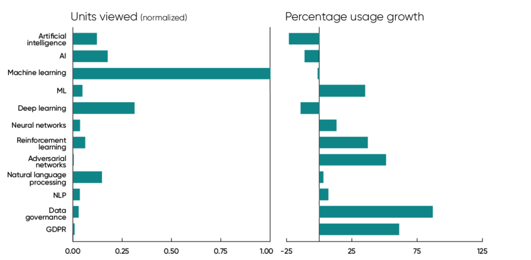 同样值得关注的是,有关数据治理(增加87%)和GDPR(增加61%)的内容显著增加。数据治理及其相关内容(如数据来源、数据完整性、审计、可解释性等)将越来越重要。未来对于数据的监管势必会更加严厉。数据治理将继续存在。