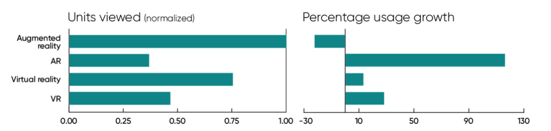 数据表明,虚拟现实、VR和AR相关内容在不断增加(分别增加了13%、28%和116%)。但由于O'Reilly的数据统计截止到去年9月,“metaverse”一词并未纳入统计,尽管它的搜索量急剧增加了489%。