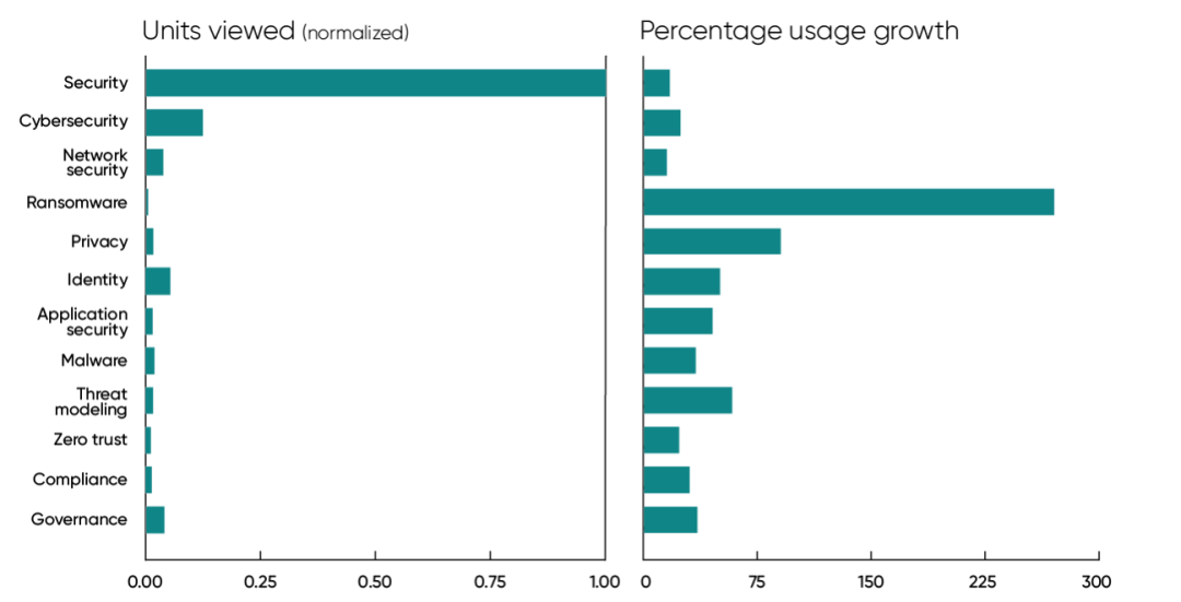 除此之外,标题中带有“安全”或是“网络安全”字样的文章浏览量分别增加了17%和24%。尽管和上述内容相比,这些关键词的增长相对缓慢,但在总数上,提及“安全”的频率远远领先于其他所有词汇。