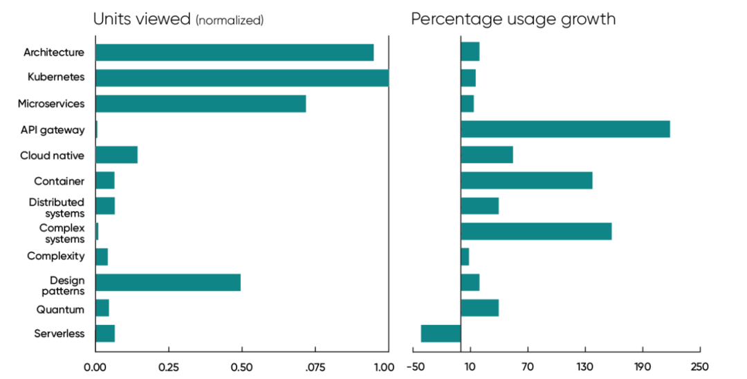 软件开发是O'Reilly平台中的一大类别,其中涵盖许多内容,例如编程语言、云以及架构等等。数据表明,软件架构、Kubernetes和微服务是2021年提及次数最多的三个主题,它们的同比增长分别为19%、15%和13%。尽管与API网关(增长218%)等主题的增长趋势相比,这三个数据的增长显得微不足道。但这也反映了一个规律:规模较小的主题的增长趋势较为明显,而已经占据主导地位的主题则增长较为缓慢。API网关相关内容的数量大约是架构或是Kubernetes内容的1/250。