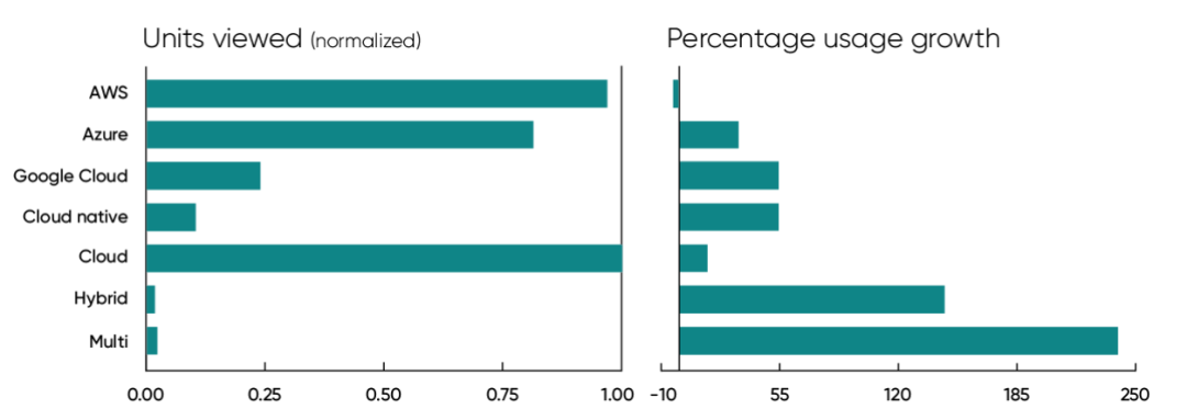 另一个趋势在于,有关混合云和多云的的内容基数依旧非常小(大约是Google Cloud的十分之一),但增长速度非常快(分别为145%和240%)。这反映了一个问题,企业无法仅仅通过单一的云服务器构建云战略。构建云战略就必须要意识到云本质上就是多(或混合的),最重要的不是选择哪一个云服务器,而是如何跨多个云服务器构建有效的云架构,这成为了云原生的一个重要内容。