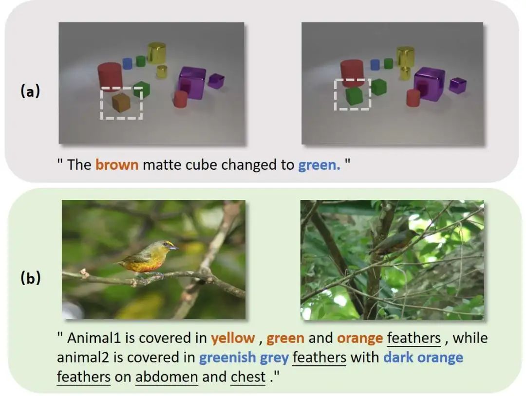 图像差异描述生成(Image Difference Captioning,简称IDC) 的目标是对比两张相似图片、捕捉它们之间的视觉差异,然后用自然语言将这些差异描述出来,如图1所示。相比于经典的图像描述生成任务(Image Captioning, 为一张图片生成内容描述),它涉及两张相似图片的内容理解与对比,更富有挑战性。这个任务在现实生活中有广泛的应用,比如协助鸟类学家区分并记录相似的鸟类品种,自动检测和描述监控视频中的场景变化等等。