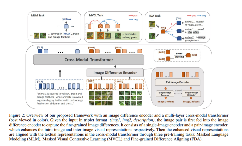 · 一方面,相似图片之间的差异是非常细粒度的,捕捉并描述出这种细粒度差异,需要建立(图片1,图片2,文本)三者之间更强的联系;