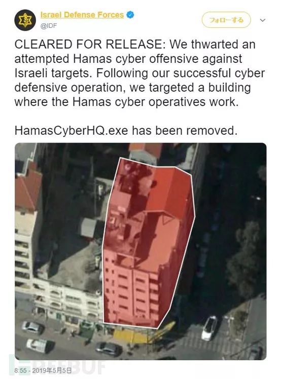 2019年5月5日, 以色列国防军(IDF) 表示,他们成功阻止了巴勒斯坦军事情报组织哈马斯(Hamas)上周末发起的网络攻击,并用无人机对位于加沙地带的哈马斯总部大楼进行了空袭。这也是IDF首次通过物理攻击方式来打击网络攻击。