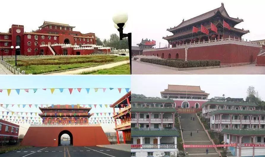 其中宁夏某市的南门楼其实是一座民国时期重建的旧城门,本来与天安门长得并不太像,但当地政府特意做了一番整容,把城墙刷成红色,中央挂上毛主席像,两边对称加上两条标语,硬生生地将一座真实的历史建筑变成了天安门的山寨版。