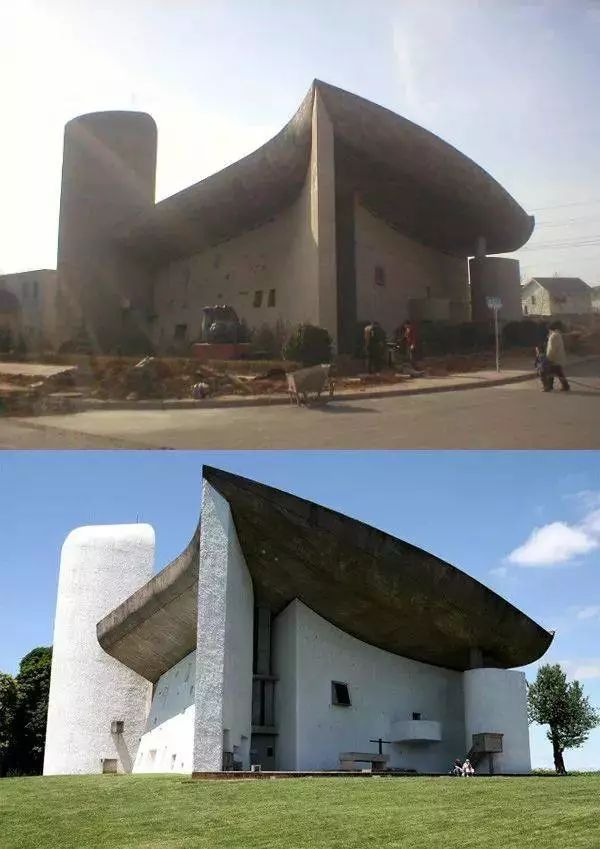 河南某经济技术开发区仿建朗香教堂(上)与法国朗香教堂(下)