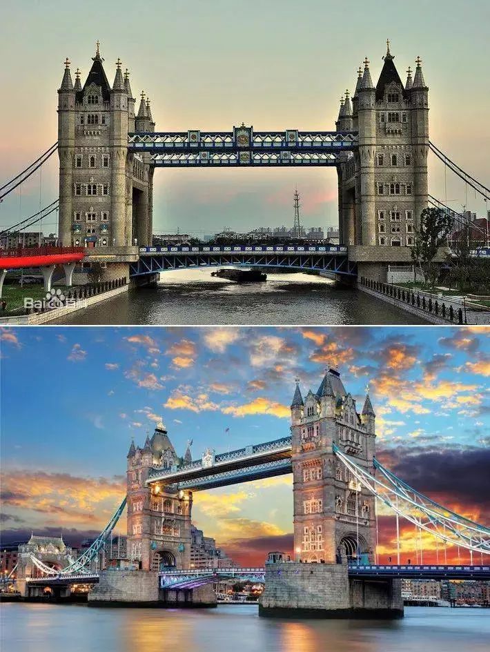 苏州相城区塔影桥(上)与伦敦塔桥(下)