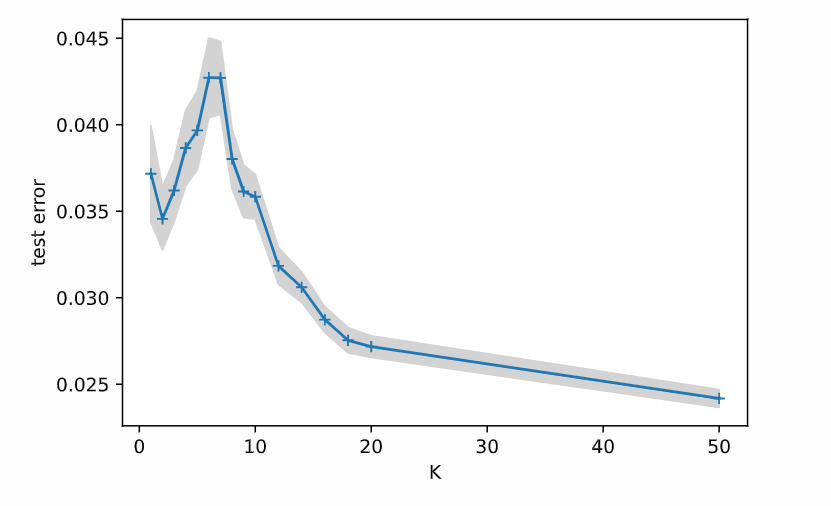 那么标签错误发生了什么呢? 标签错误会导致损坏的训练点附近的某些区域被分配给错误的类。然而,附近正确类的点越多,错误分类的区域就越小。我们可以交互地尝试。随着点数的增加,测试误差会减少。