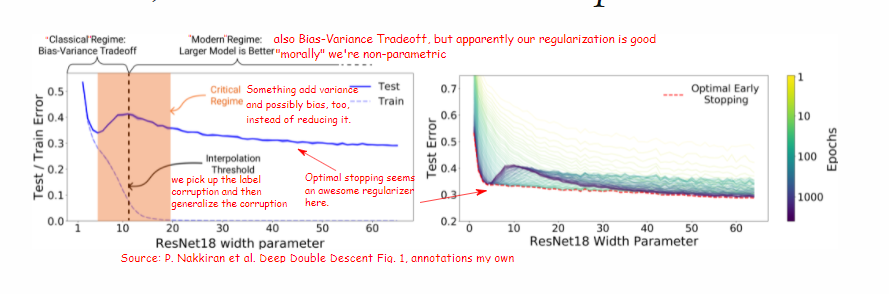 M. Belkin等人把条件中的“传统(classical)”和“现代(modern)”等限定词用引号括了起来。“现代”条件是一种十分之非参数的学习,具有一种我们还需要更加深入理解的正则化。