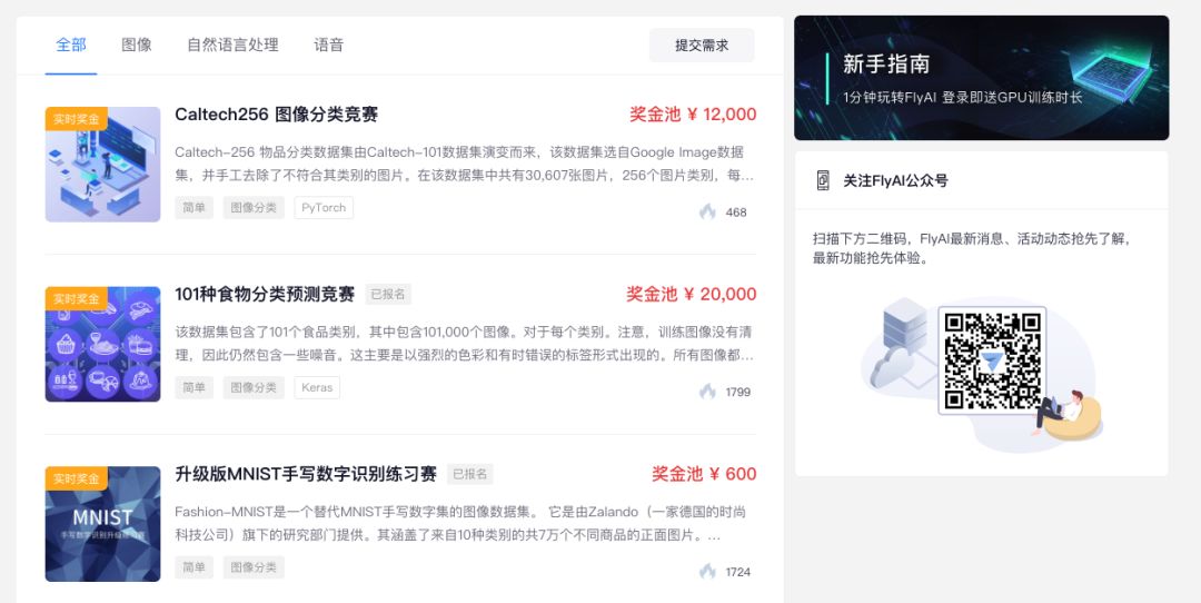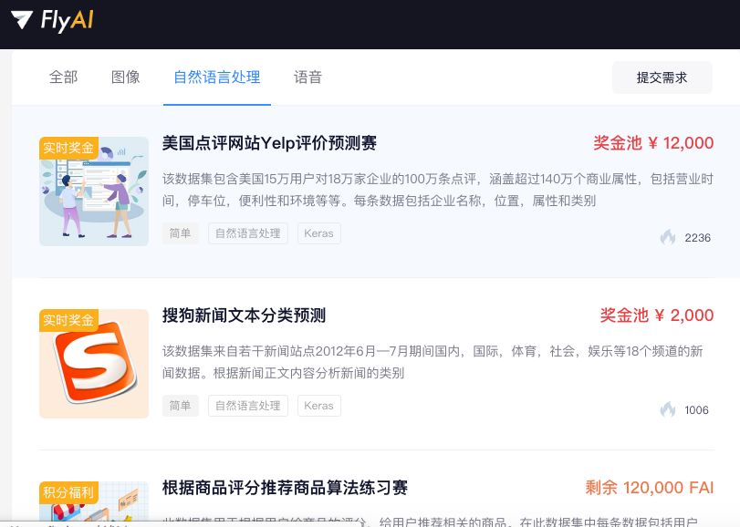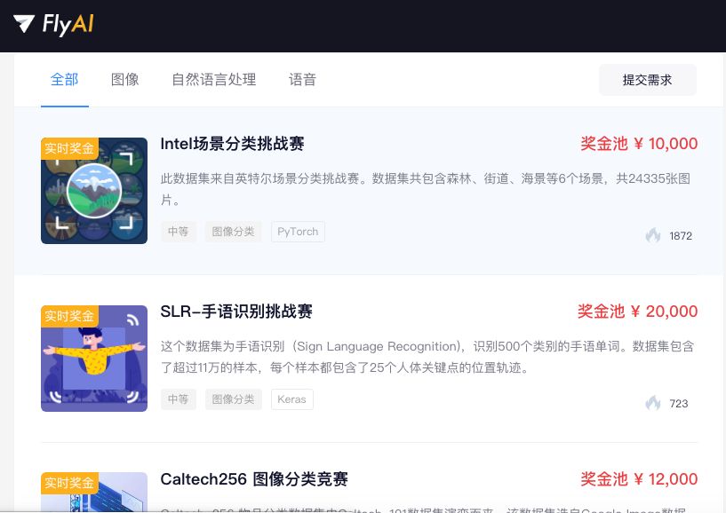 FlyAI是一个为算法工程师提供(深度学习)项目竞赛并支持GPU离线训练的网站。目前每周更新两个以上现金奖励的竞赛项目。项目涉及领域包括图像识别/分类/检测、自然语言处理(NLP)、语音识别等。
