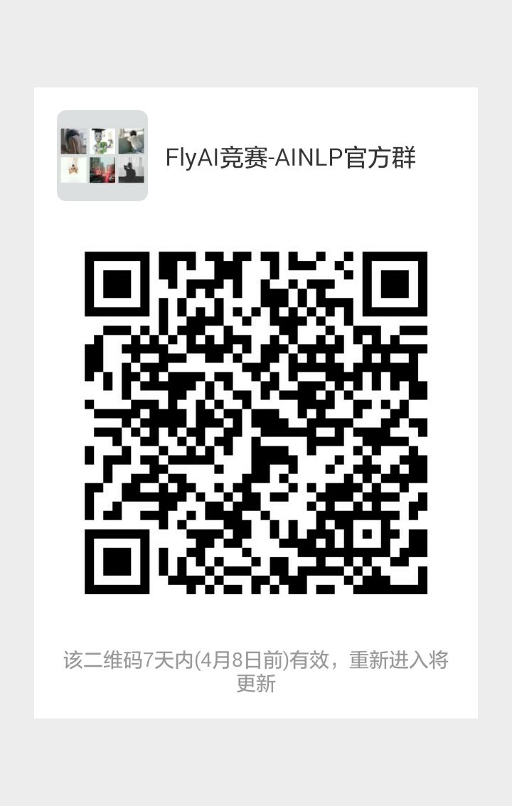 FlyAI联合AINLP建立了专门的竞赛讨论群,群内有官方技术人员答疑,欢迎下方扫码进群:
