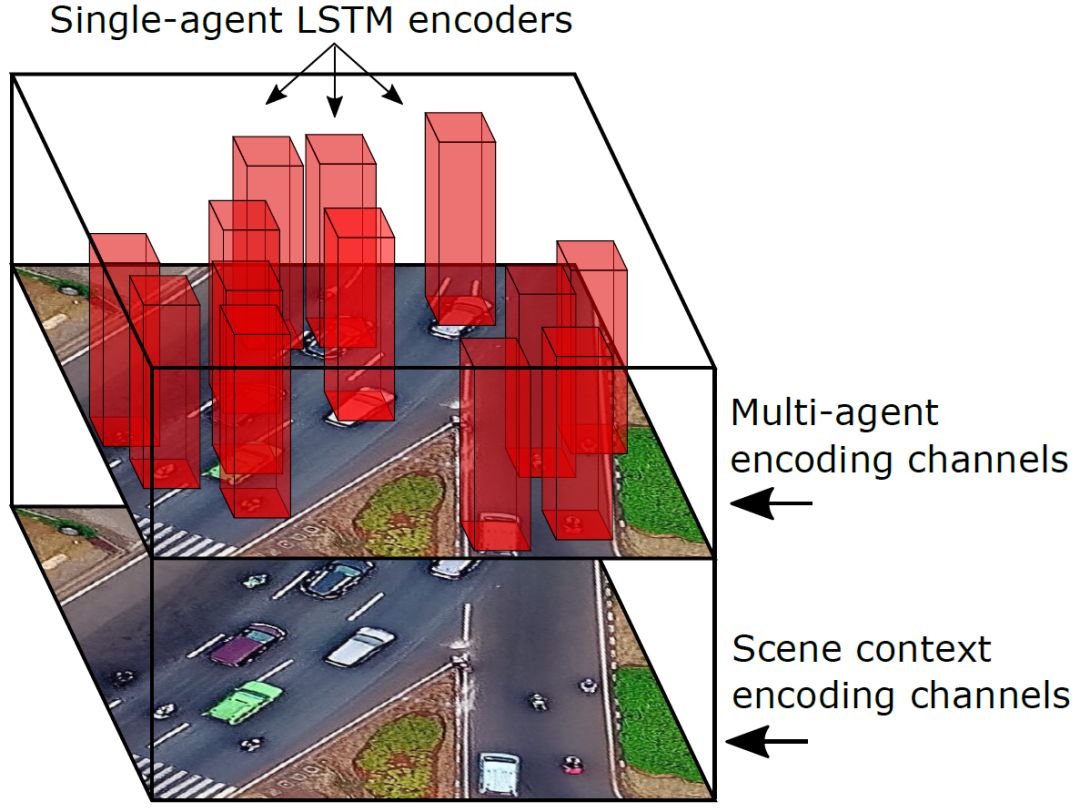 MAT 编码是一个鸟瞰视角的静态场景和动态多智能体的特征图(Feature Map),包括多智能体编码通道(Multi-Agent Encoding Channels)(上)和静态场景编码通道(Scene Context Encoding Channels)(下)。单智能体长短时记忆网络(Single Agent LSTM)编码器输出的多智能个体特征向量(红色)在空间上根据这些智能体的坐标对齐,构造出多智能体编码通道。多智能体编码通道与静态场景编码通道(场景编码全卷积网络的输出特征图)对齐,以保持智能体与场景间的空间结构。