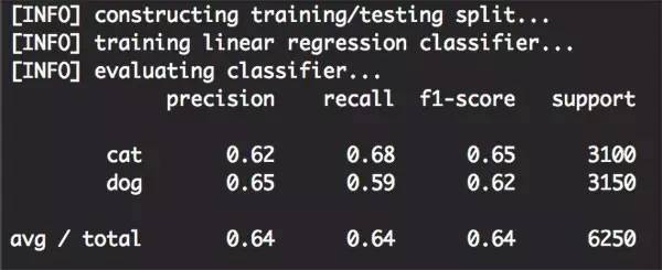 最后,我们在kaggle 狗vs猫的数据集上,利用Python, OpenCV, 和 scikit-learn进行线性分类。从数据集提取出颜色直方图之后,我们在特征向量上训练一个线性支持向量机,并且得到64%的分类精度,这已经很不错了,因为(1)颜色直方图并非狗和猫特征化的最佳选择(2)我们没有对线性SVM进行调参。