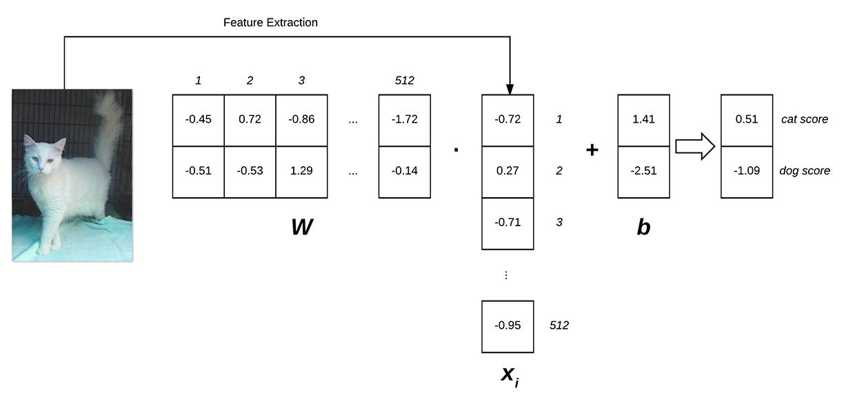 回到Kaggle的猫和狗例子中, 每个都表示为512维颜色直方图,因此的形状是[512 x 1]。权重矩阵W的形状为[2 x 512],而偏置矩阵b为[2 x 1]。