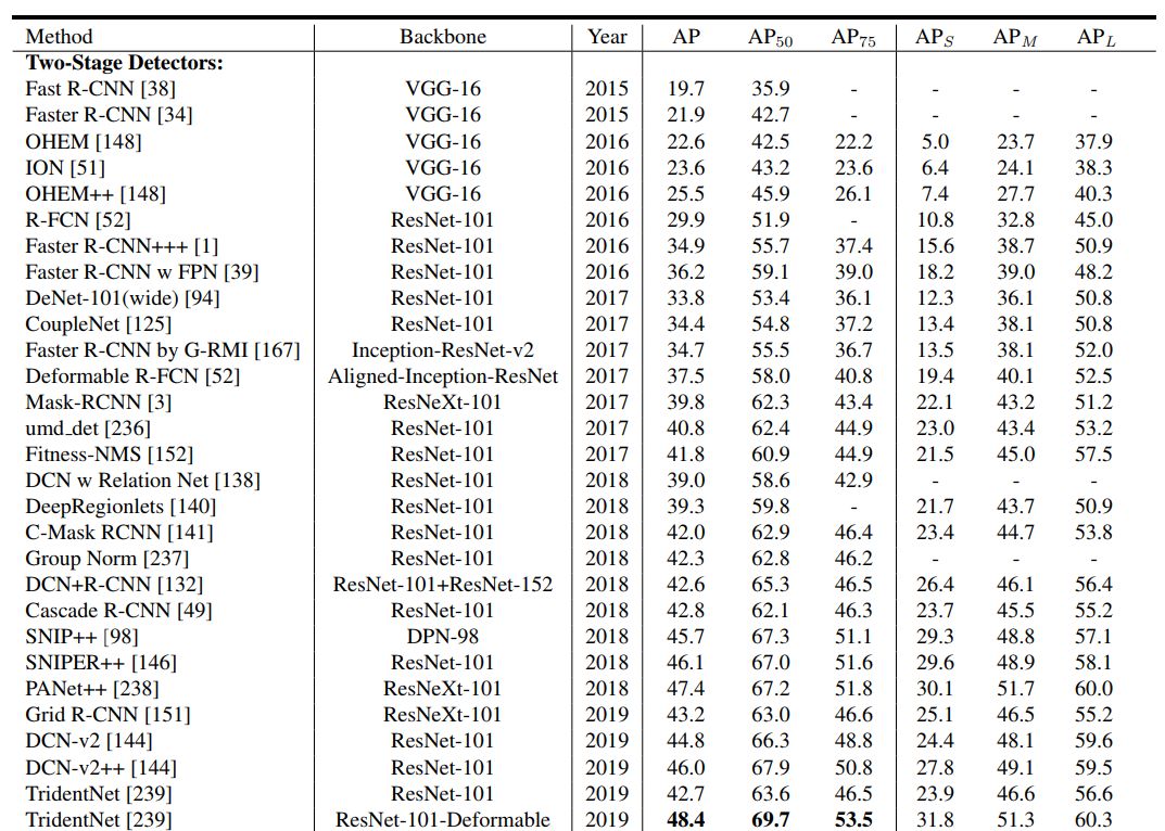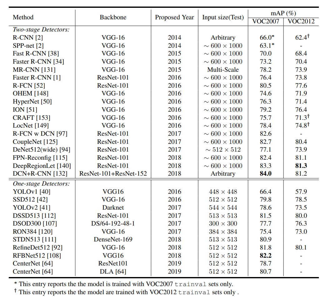 在下面表 2 和表 3 中,论文展示了近几年各种目标检测方法在 VOC2007、VOC2012 和 MSCOCO 基准上的效果。