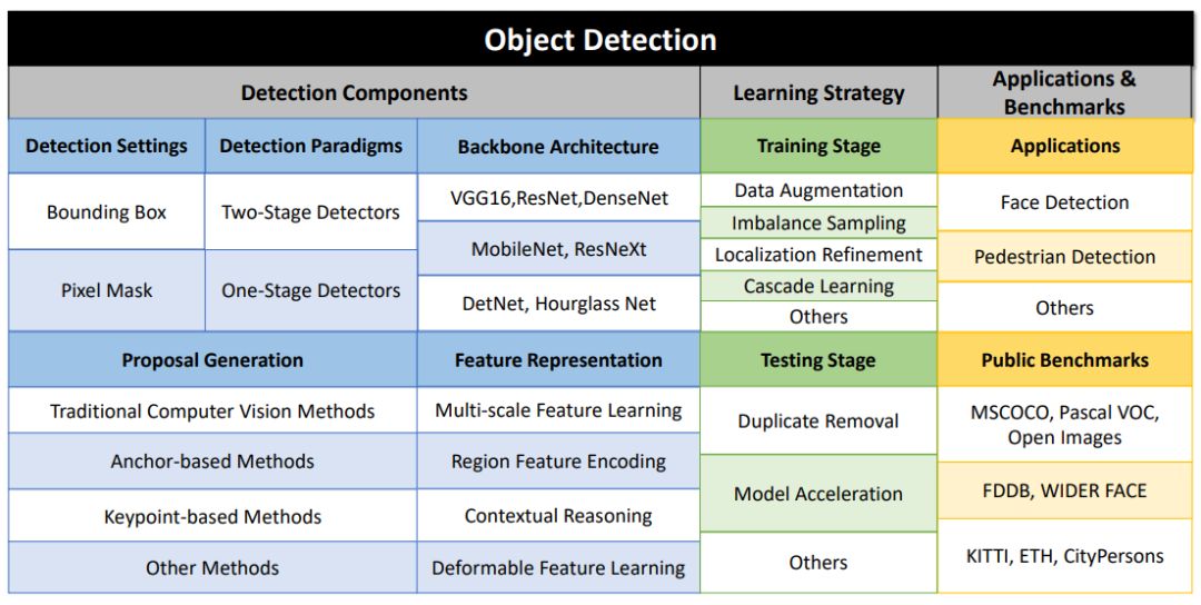 对于学习策略,论文首先强调了学习策略的重要性(因为训练检测器是很艰难的过程),然后详细介绍了训练和测试阶段中的优化技术。最后,论文概览了一些基于目标检测的现实应用,并展示了近年来通用目标检测技术在公开基准上的当前最优结果。