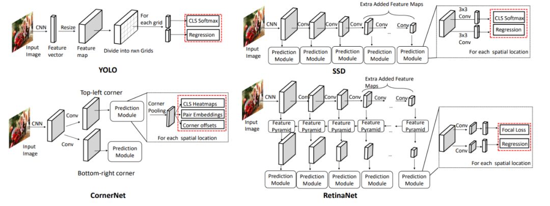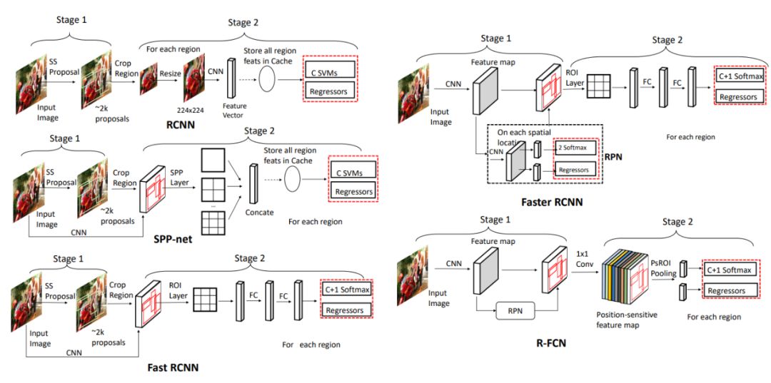 图 4:不同二阶目标检测框架概览。红色虚线矩形表示输出(该输出定义损失函数)。