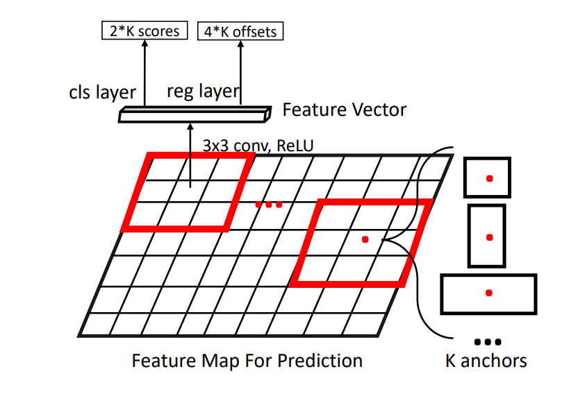 该网络使用 3 × 3 卷积核在整个特征图上滑动。对于每个位置,网络都考虑 k 个 不同大小和宽高比的锚点(或边界框的初始估计)。这些不同的尺寸和宽高比允许网络匹配图像中不同尺寸的对象。