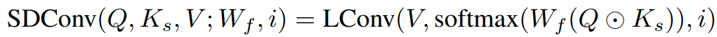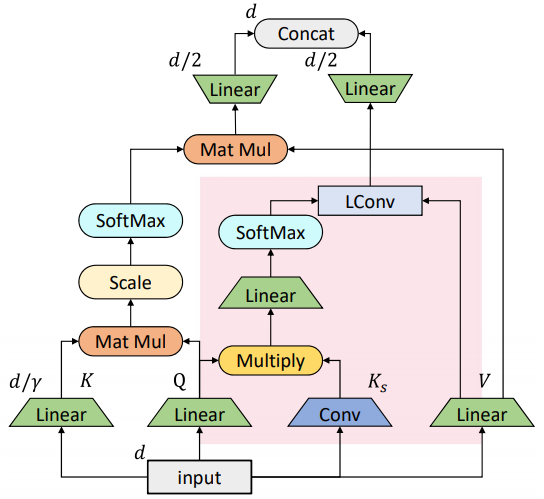 此处,输入 X 先经过线性变换生成Q和V,同时经过卷积生成基于跨度的Ks,Q⊙Ks线性变换以及 softmax 来产生卷积核与V进一步做轻量卷积,从而得到最终的输出。