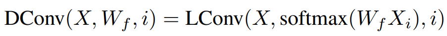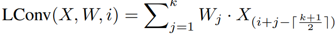 其中X∈R^n×d为输入的特征,而W∈Rk则是卷积核,k 为卷积核的大小。轻量卷积的作用是将输入的每个词对应的特征附近的 k 个特征加权平均生成输出。在此基础上,之前提到的动态卷积可以写作