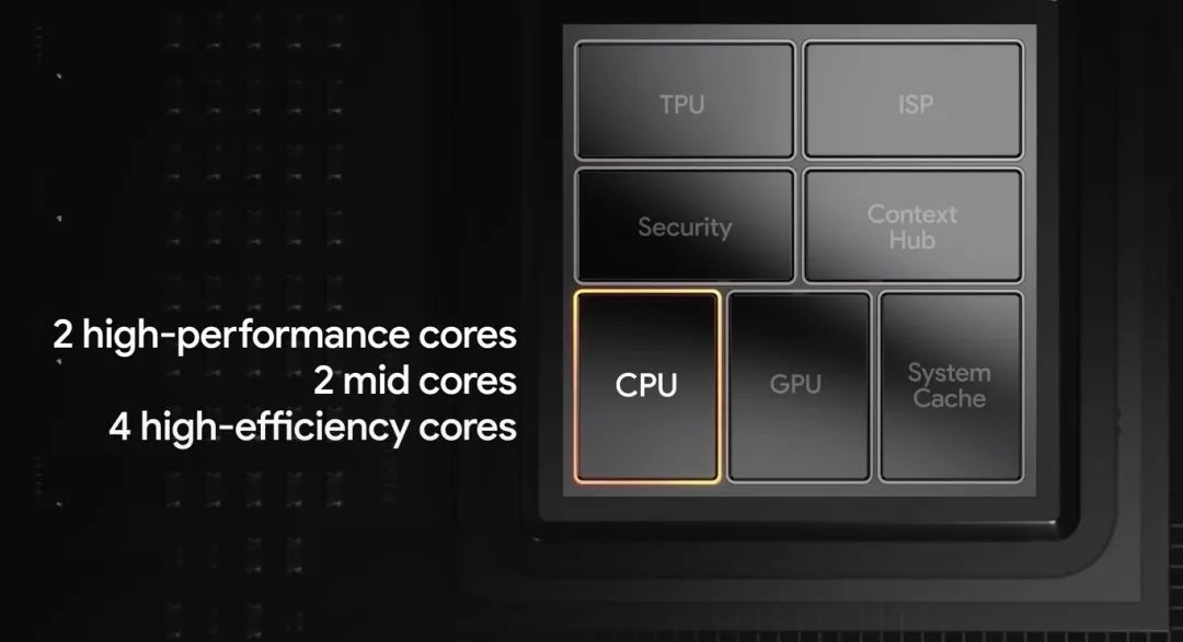 谷歌 Tensor 的结构略显诡异。它集成 “2+2+4” 的八核心 CPU,拥有两颗 X1 2.8GHz 超大核心、两颗 2.25GHz A76 大核心、四颗 1.8GHz A55 小核心。与 Exynos 2100、骁龙 888 相比,它多了一颗 X1 核心,但大核由 A78 换成了上两代的 A76 且主频偏低。