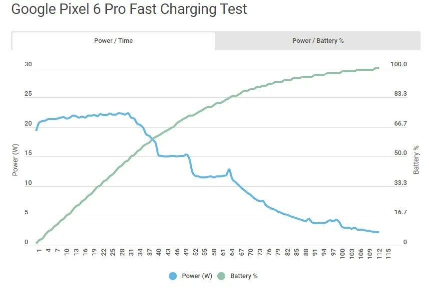 Pixel 6 Pro 充电耗时长的主要原因是,它早早地就降低了充电功率。在我们的测试中,Pixel 6 Pro 以 20W 以上功率充至于 50% 之后,充电功率就会逐渐降低至 15W;从 90% 充至满电,它花了半个小时,将近充满时的充电功率为 2.5W 左右。