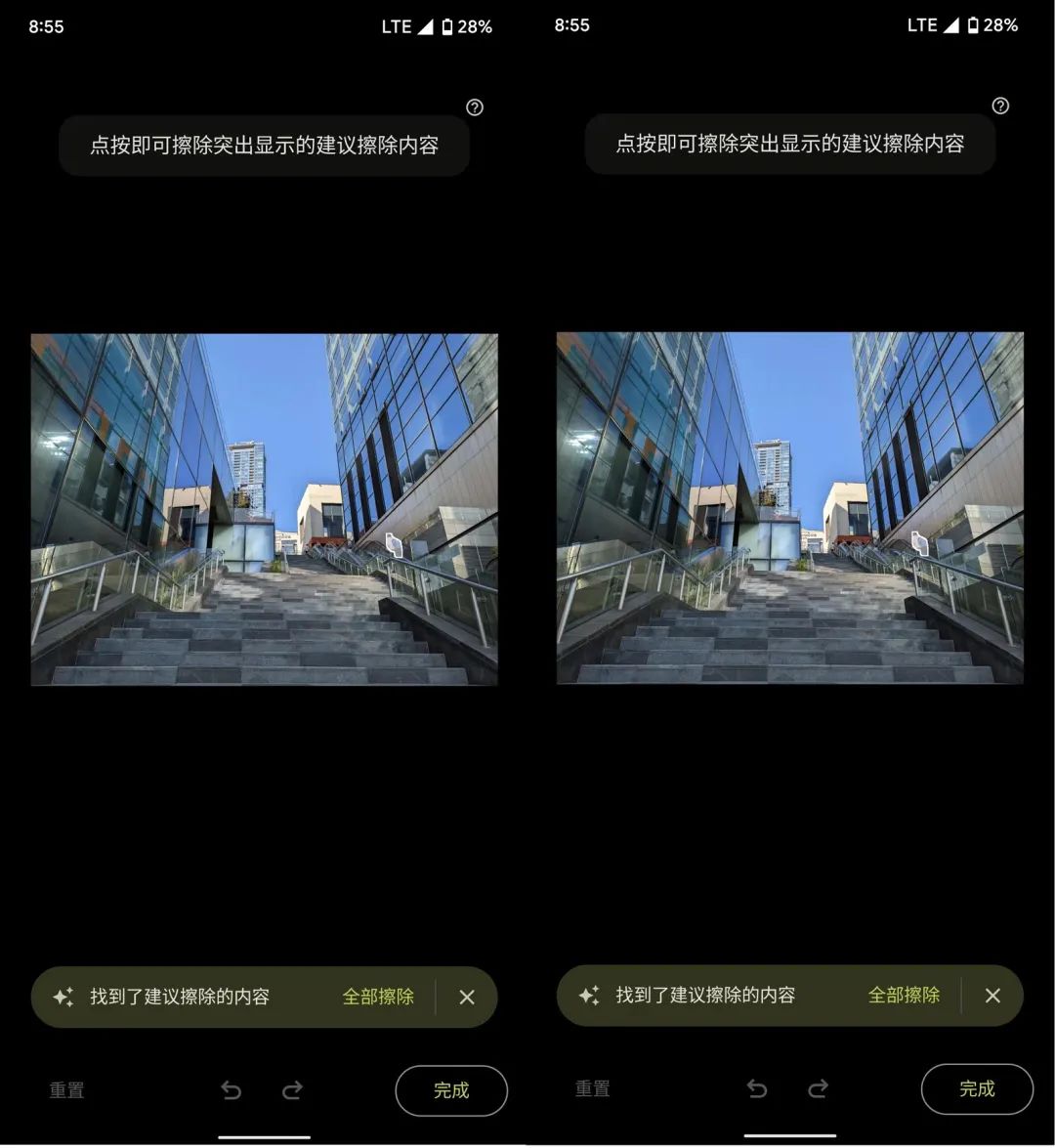 Pixel 6 Pro 还引入了一些方便趣味的小工具,比如橡皮擦和运动模式。橡皮擦功能可以自动或手动消除画面中的对象,比如抢镜的人或物等,效果不能说以假乱真,至少不放大是能凑合用的。