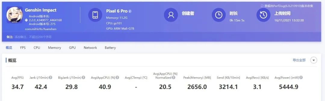 直接看《原神》吧,在游戏数据包下载阶段,Pixel 6 Pro 就已经开始“热身”了——是真的有些热,我们不得不等它降温了之后才开始测试。把游戏画面设置为最高,15 分钟分钟游戏下来,Pixel 6 Pro 平均帧数仅有 34.7fps。