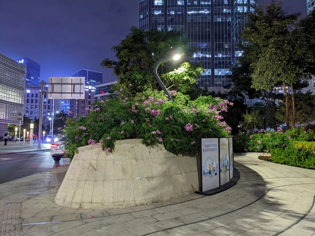 比如下面这组 Pixel 6 Pro 和 Pixel 4 XL 夜视模式对比样张,第二张图中 Pixel 4 XL 的色彩可能更讨喜一些,但当时的实际情况更接近第一张图,树叶在灯光下是更偏黄色的。