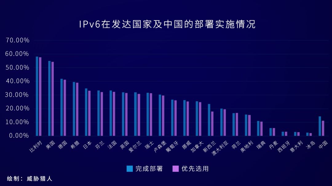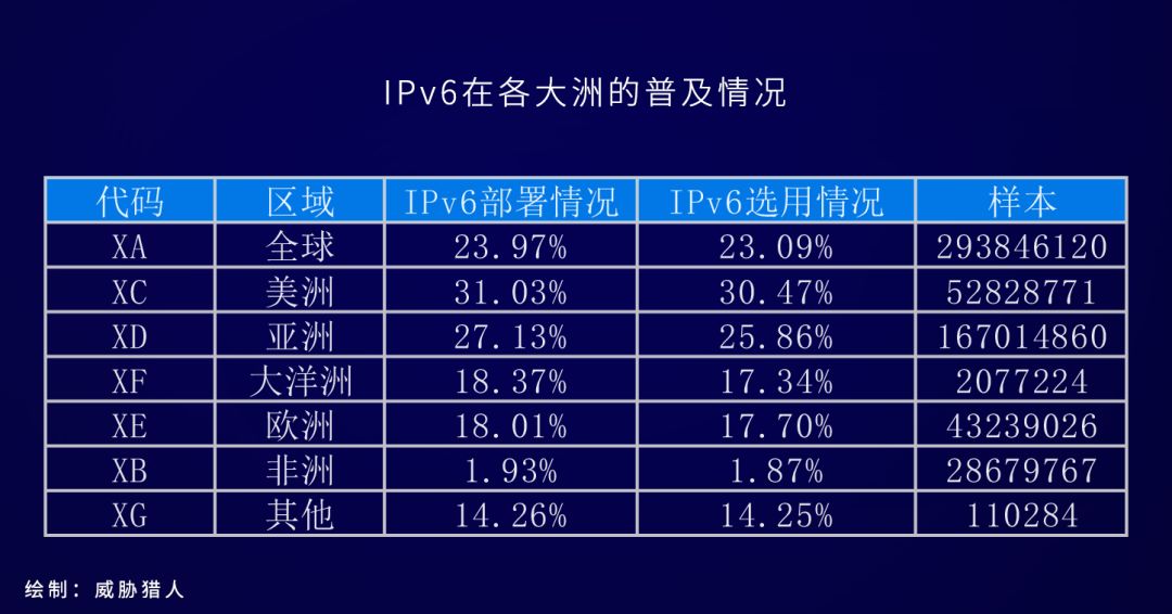 目前全球IPv6普及率达到23.97%,发达国家的IPv6普及率为25%,而全亚洲IPv6普及率达到27.13%,其中,中国的IPv6普及率达到了14.46%。以下是各大洲和发达国家以及中国的IPv6普及率统计结果:
