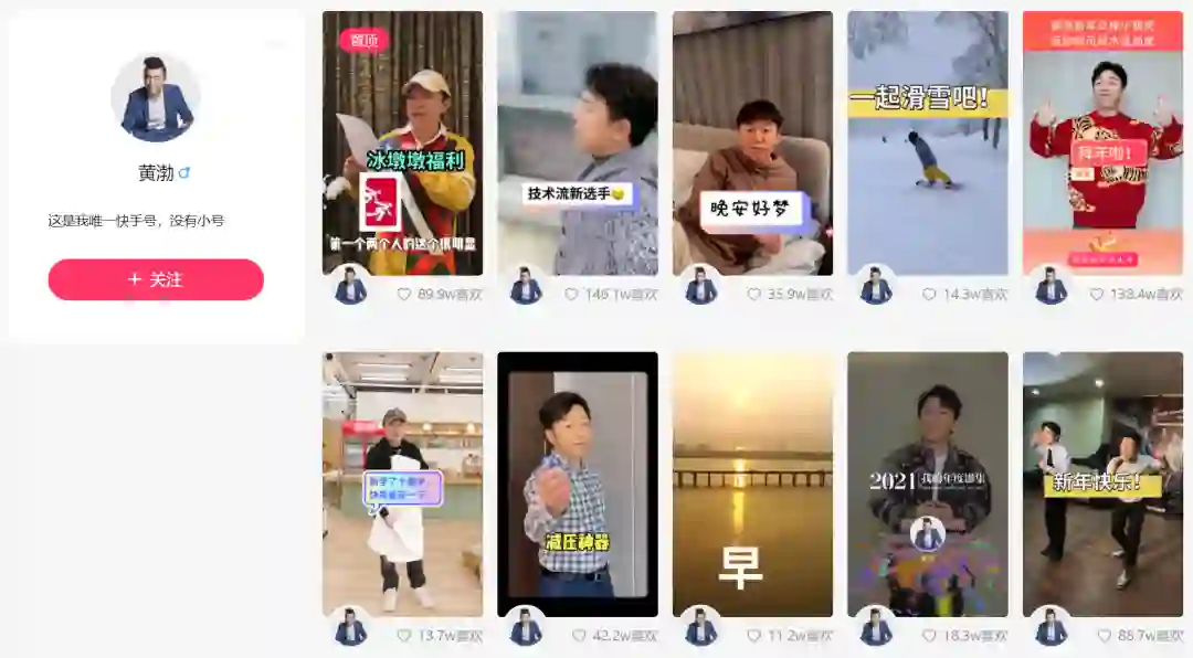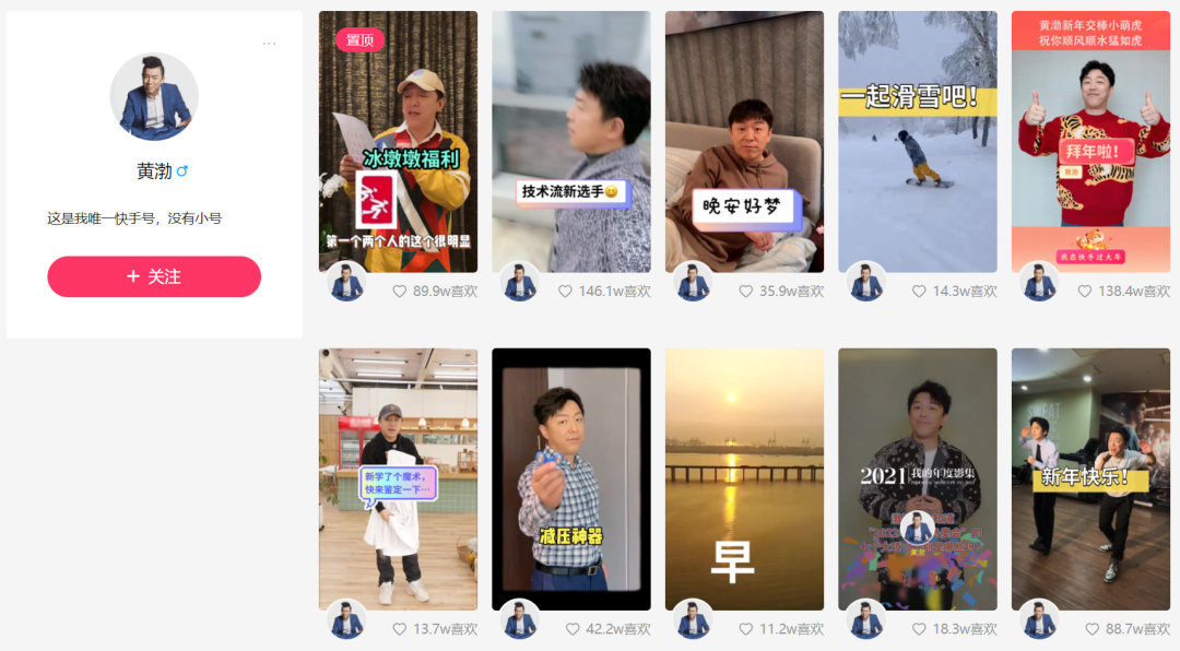 早期入局者,多是出于个人爱好,且在当时抖音缺少内容创作者的情况下充当了内容来源,并因此获取了宝贵的原始流量。譬如说陈赫和欧阳娜娜。在快手,也有诸如诸如黄渤、潘长江、郭冬临等和其气质相合的明星,先行一步玩起了短视频。