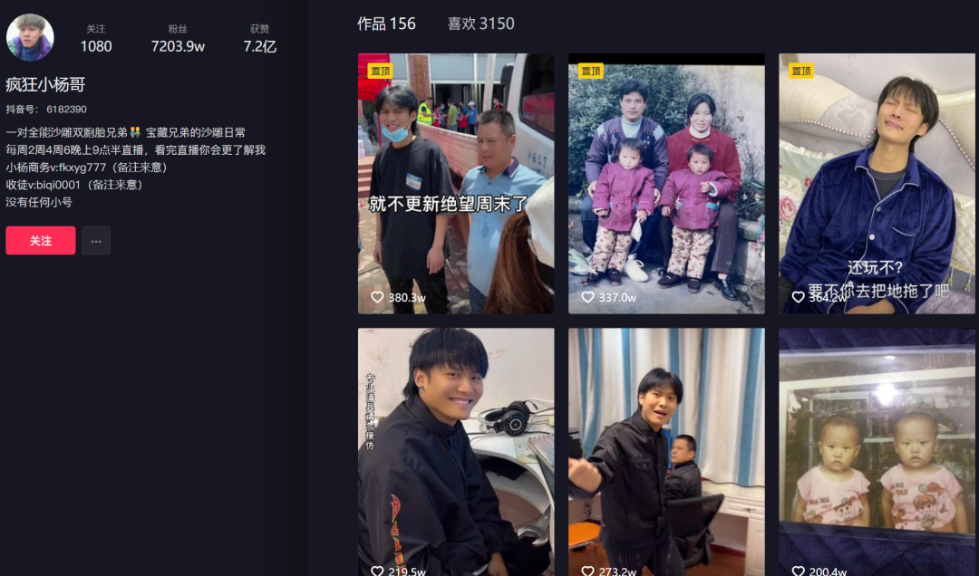 但现在,抖音的个人号粉丝第一位,并不是本身就有流量,人尽皆知的“明星”,而是从抖音本土生态里逐渐杀出来的“疯狂小杨哥”。