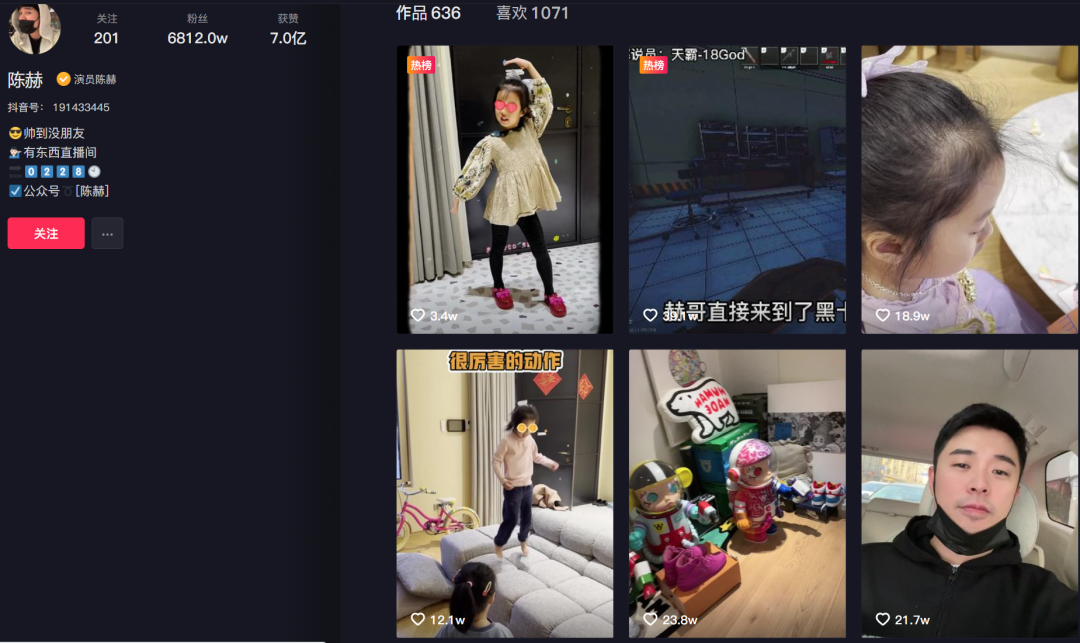 很长一段时间内,陈赫,这个从18年1月(彼时抖音日活用户数量仅3000万)就开始“玩抖音”的“明星”,是抖音个人号粉丝第一位。后来,几乎是在平台的全力宣传和流量漫灌之下,刘德华的粉丝数一度超过了陈赫。