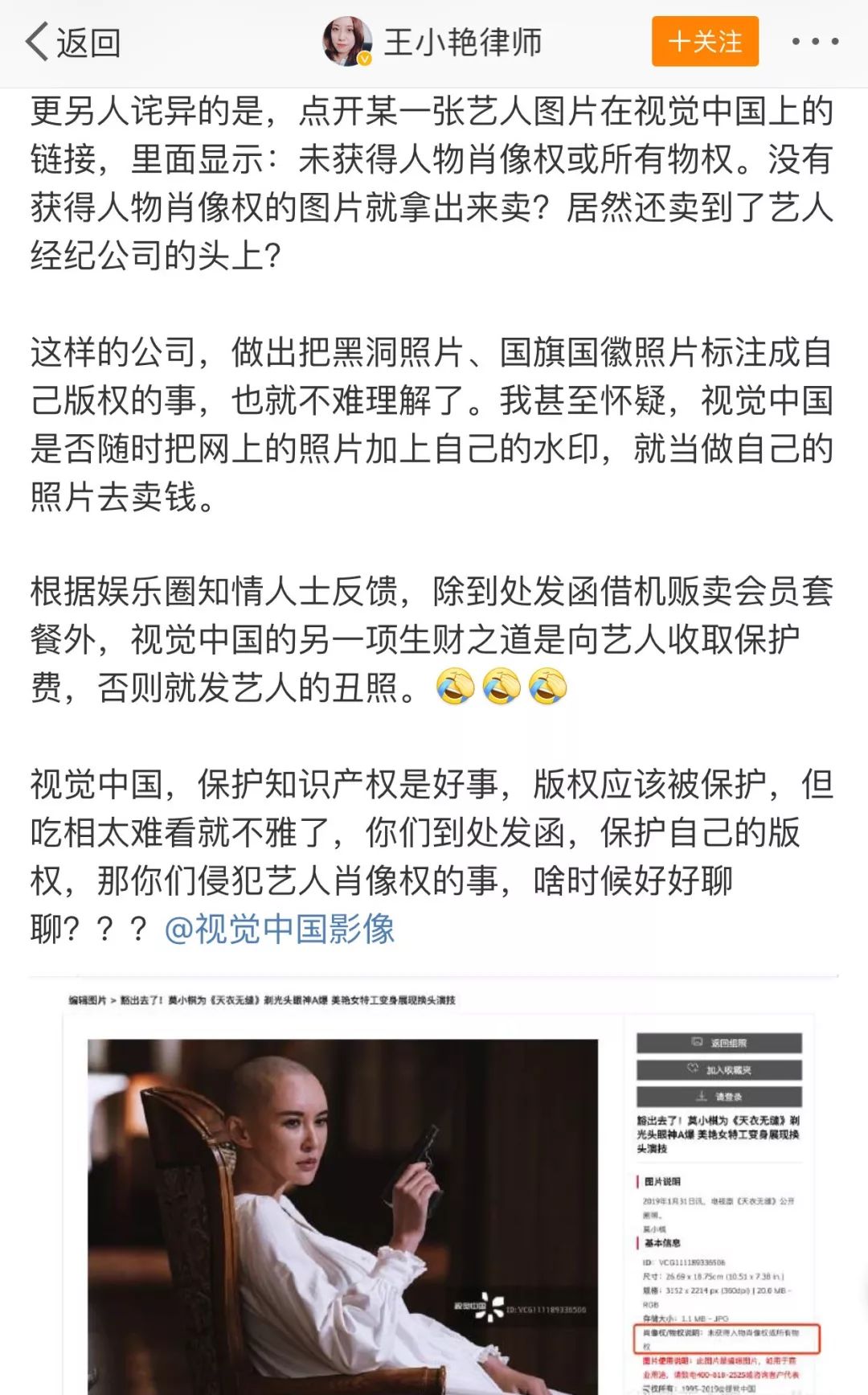 4月11日,演员莫小棋发微博称,公司收到了视觉中国发来的文件,要求其支付照片的版权费用。但实际上视觉中国列出的照片都是莫小棋通过剧组的渠道获取自己的照片并非从网上搜索下载。4月12日,《IT时报》记者与演员莫小棋的律师进行了沟通,对方表示目前正在确认中。