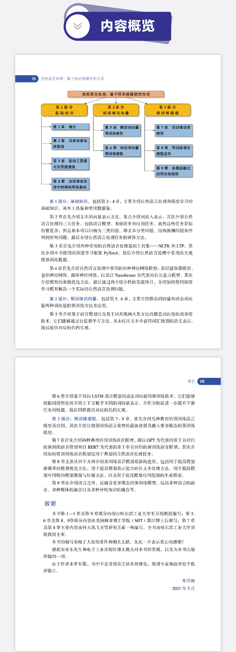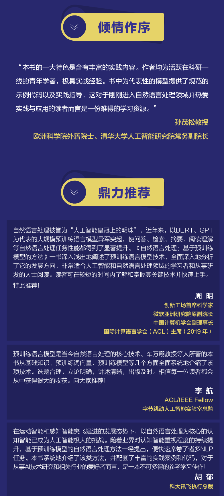 本书由哈工大社会计算与信息检索研究中心(SCIR)多位学者编写,由哈工大社会计算与信息检索研究中心(SCIR)副主任车万翔教授、麻省理工大学(MIT)计算机科学与人工智能实验室博士后研究员郭江博士、科大讯飞北京研究院副院长崔一鸣编著,由哈工大计算学部主任刘挺教授主审。本书既适合具有一定机器学习基础的高等院校学生、研究机构的研究者,以及希望深入研究自然语言处理算法的计算机工程师阅读,也适合对人工智能、深度学习和自然语言处理感兴趣的学生和希望进入人工智能应用领域的研究者参考。
