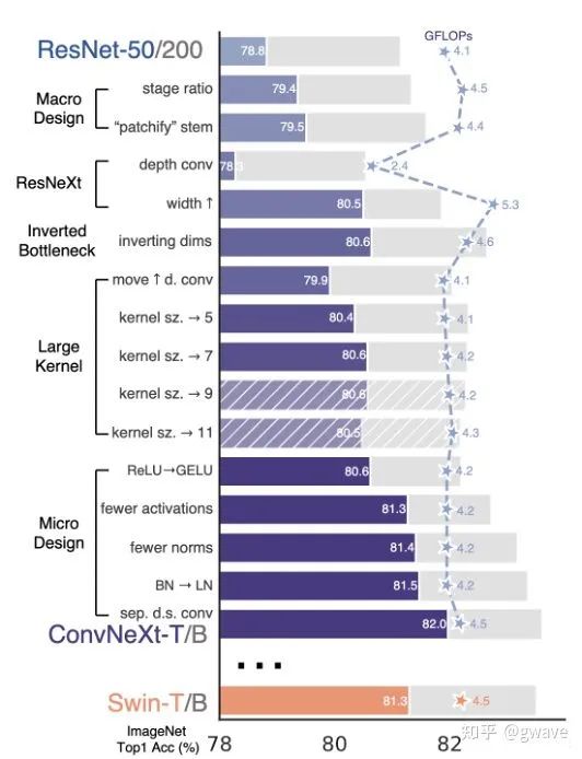 ConvNeXt 采用标准神经网络 ResNet-50 并对其进行现代化改造,以使设计更接近ViT,使用 AdamW 优化器,使用更多 epoch 对其进行训练,应用花式数据增强技术和正则化(高斯误差线性单元GELU代替Relu),使用大卷积核和Inverse Bottleneck(中间粗两头细)。