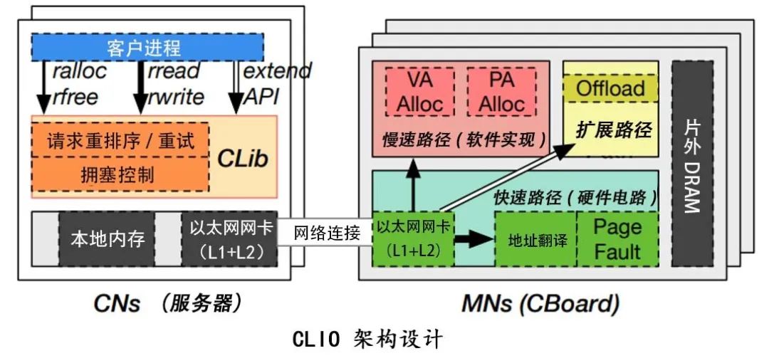 在Clio中计算节点(CN)直接使用以太网网卡连接到机柜交换机中,同时将内存节点(MN)直接连接到交换机上,在计算节点中运行的程序可以通过用户态库CLib使用内存节点的资源。