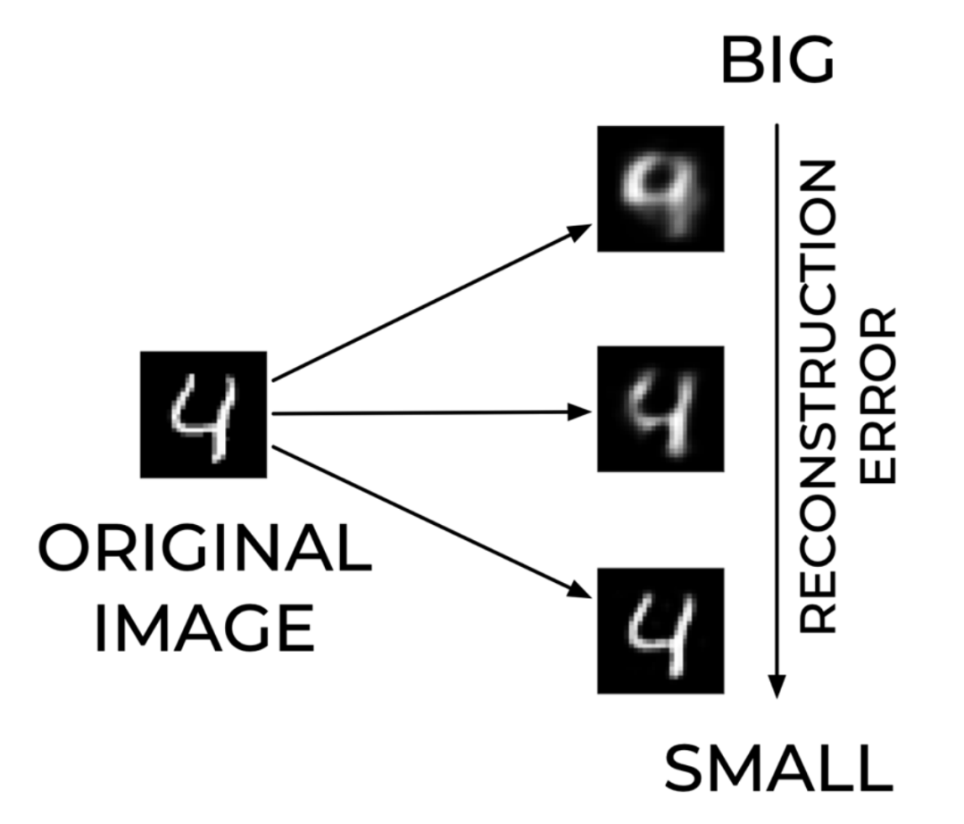这很容易计算出来。在使用自编码器进行异常检测时,常常用到 RE。对于重建误差有一个简单的直观解释。当 RE 值较大时,自编码器不能很好地重构输入信号,当 RE 值较小时,重构是成功的。下图 3 展示了一个自编码器试图重建图像时出现的大大小小的重建错误的示例。