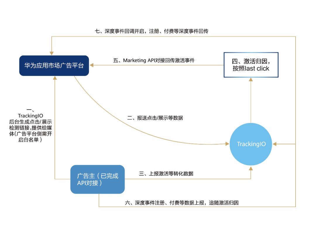 归因的重要部分之一是数据回传,实现数据的双向交互,为后续投放持续创造价值。数据回传一般用于广告投放平台后端的模型训练,比如oCPX,对后续的投放具有“反哺性”。以华为应用市场推广平台与TrackingIO的数据交互来简单展示下回调配置的动作。
