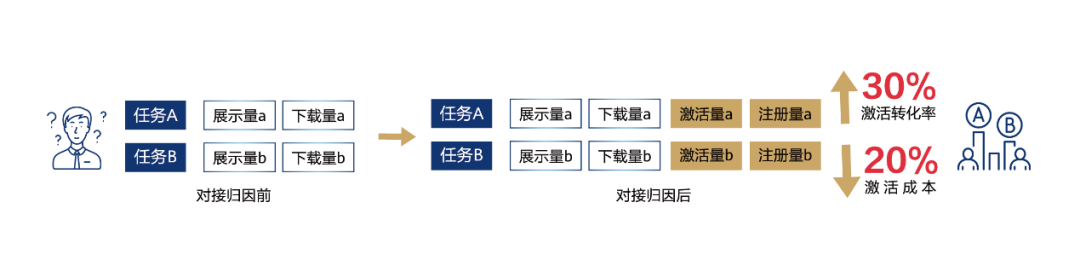最早,是以Facebook广告平台为代表的信息流渠道提供了归因能力,而近两年来,应用商店也在持续开放归因能力。其中,华为应用市场率先开放归因能力,并提供智能分包和监测链接两种归因工具,已助力上百名广告主看清每个推广任务的后端效果。从某视频应用广告主了解到,其在华为应用市场开放归因功能之前,难以看清每个广告计划的后端效果,一直苦于粗略的数据分析无法带来更深层次地改进。在对接归因之后,其能清晰地看到了每条任务的深层数据,如任务A的用户注册率较高,任务B的用户打开激活情况更好等。该广告主结合投放数据与自身的考核指标,相应地调整广告任务结构以及出价和预算,提升精细化运营程度。经过一段时间的优化后,应用的转化率提升30%+,成本降低近20%,真正做到了降本增效。