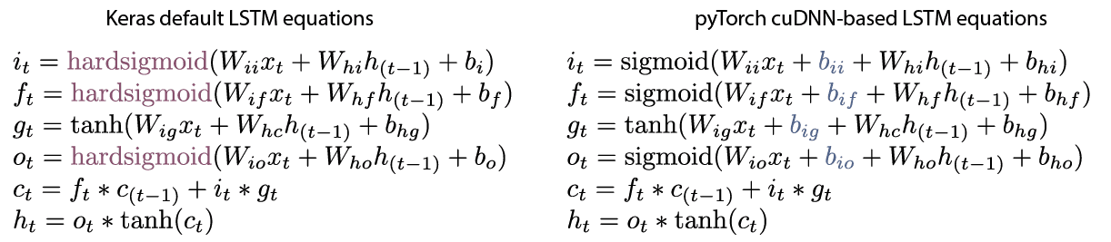 该模型是使用针对LSTM的回归内核的Theano/Keras默认激活函数hard sigmoid训练的,而pyTorch是基于NVIDIA的cuDNN库建模的,这样,可获得原生支持LSTM的GPU加速与标准的sigmoid回归激活函数: