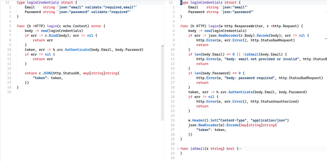 我还发现,用 echo 编写应用程序时有一些比较精简的样板(主要是解析 json body、编写 errors 以及手动设置 headers 等),让代码的可读性有所提高。