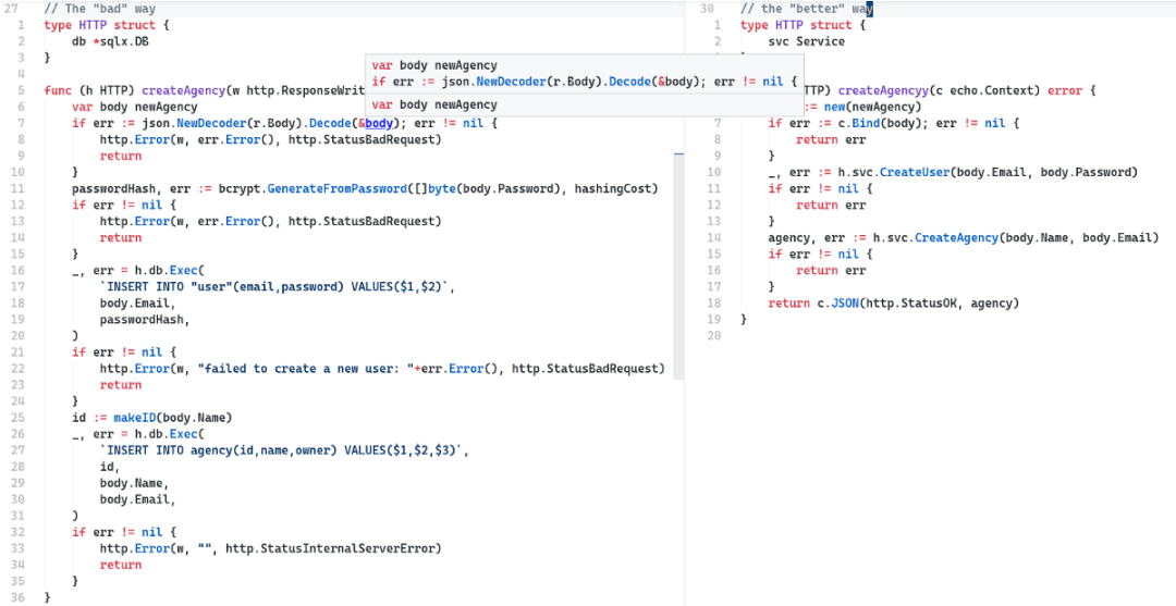关于 Go 的问题是,你很容易跳过关于构建代码结构的学习,使得代码很难阅读和维护。如果你还不知道我在说什么,下面是我不久前写的一个(糟糕的)Go 端点例子: