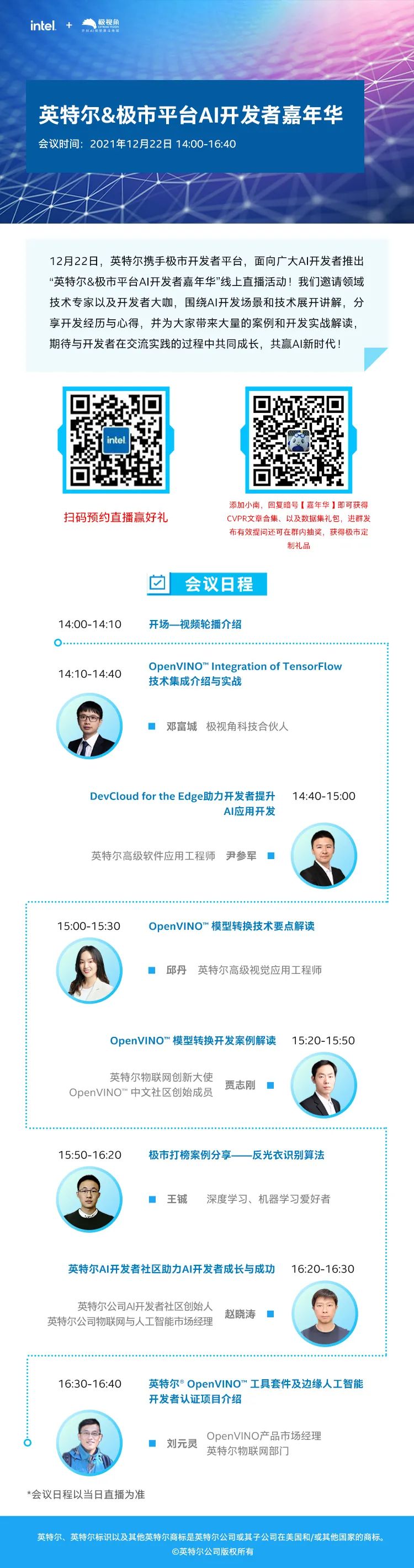 12月22日,英特尔携手极市开发者平台,面向广大AI开发者推出线上直播“英特尔&极市平台AI开发者嘉年华”活动!行业大咖将率先现身主题演讲,与大家分享以AI为核心的全场景智慧时代的行业动态。